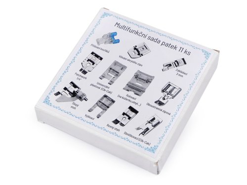 Multifunkční sadu kovových a plastových patek ocení každý, kdo doma rád a často šije. Rychloupínací systém patek je vhodný pro většinu domácích šicích strojů. Sada obsahuje: - patku na přišívání knoflíků - patku na všívání skrytého zipu - zakládací 3 mm patku - patku na patchwork 1/4" - plastovou univerzální (cik-cak) patku - rolovací patku (na koženku, vinyl...) - oboustrannou zipovou patku - patku na slepý steh - vyšívací patku - patku na rovný steh - obnintkovací (cik-cak) patku