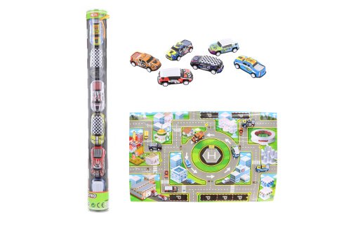 Koberec se šesti kovovými autíčky. Obasahuje igelitový koberec pro autíčka .Rozměry balení 5 x 40,5 x 5 cm. Věk 3+