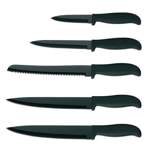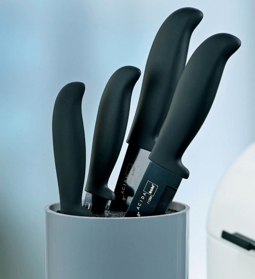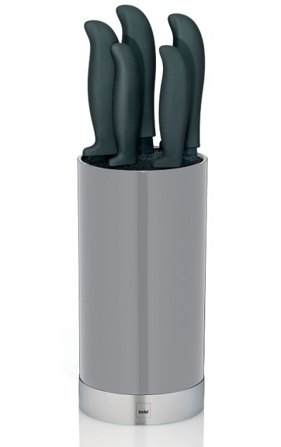 Vysoce kvalitní nože z oceli v černé barvě ve stojanu z PP plastu šedé barvy. Praktický vnitřek je tvořen tenkými plastovými tyčemi, které umožňují libovolné umístění nožů a zabraňují poškrábání ostří.Sada obsahuje:- 1x kuchyňský nůž- 1x vykošťovací nůž - 1x nůž na pečivo - 1x porcovací nůž - 1x kuchařský nůž- 1x stojan (výška 22,5 cm, průměr 11 cm)- značka: KELA