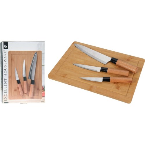 4dílná sada nožů s bambusovým prkénkem, nerezovými noži a bambusovými rukojeťmi obsahuje:1 x bambusové prkénko 350 x 250 x 15 mm1 x kuchařský nůž 1,5 mm, 330 x 50 x 1 mm1 x univerzální nůž 1,2 mm, 245 x 25 x 1 mm1 x loupací nůž 1,2 mm, 210 x 25 x 1 mm