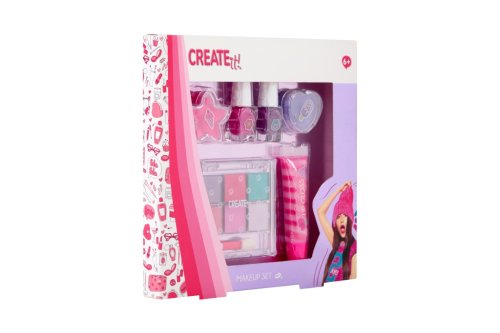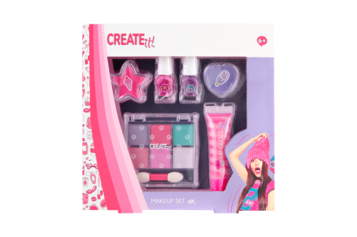 Sada líčení Creat it Lila Turquoise – obsahuje 2 laky na nehty, křídu na vlasy, velký štetec, balzám na rty, rtěnku, malý oboustranný štěteček, sada 6 třpytívých stínů na oči.