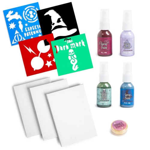 Sada malování sprejem na plátno Harry Potter – pro všechny fanoušky Harryho Pottera. Vyberte si ze čtyř šablon a čtyř barev a nastříkejte sprejem obrázky na přiložené plátno. Balení obsahuje – 4× barvu ve spreji – modrá, červená, zelená, fialová, 3× plátno na malová a 4× šablony s motivem Harry Potter.