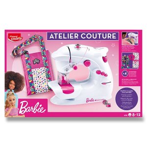 Sada obsahuje:, * funkční šicí stroj Barbie (včetně adaptéru a nabíječky), * šicí potřeby včetně jehel a nití, * návod na ušití 4 různých produktů, * 12 vzorníků látek v různých velikostech, * nášivku Barbie