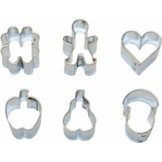 Sada 6ti mini vykrajovátek (hříbek, panáček, srdce, čtyřlístek, hruška, jablko) z pocínovaného plechu.