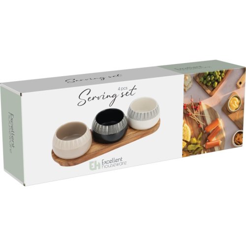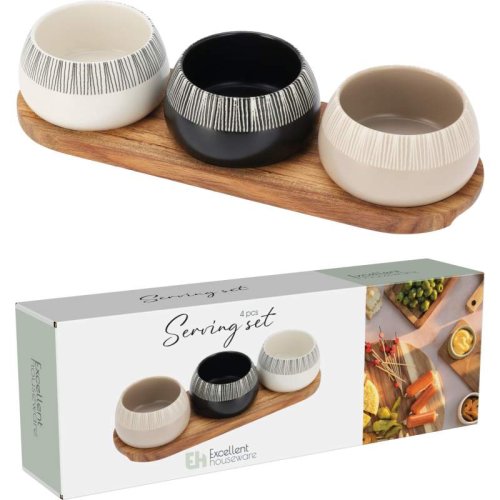 Vychutnejte si servírování s vkusem. Tato stylová sada kombinuje rustikální prkénko z akáciového dřeva a tři kameninové misky s jemným proužkovaným vzorem. Ideální pro podávání drobného občerstvení, omáček, oříšků či tapas.
