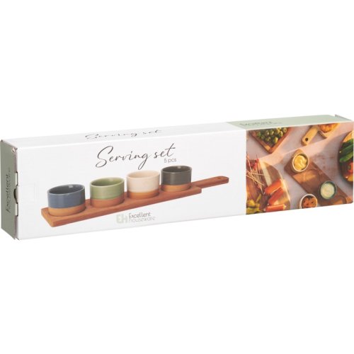 Tato elegantní servírovací sada kombinuje funkčnost a přírodní krásu. Čtyři kameninové misky v tlumených barvách jsou usazeny na podlouhlém prkénku z tmavého bambusu – ideální na servírování omáček, dipů, oříšků nebo sladkostí. Skvěle zapadne do každé kuchyně i na slavnostně prostřený stůl.