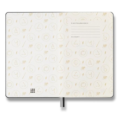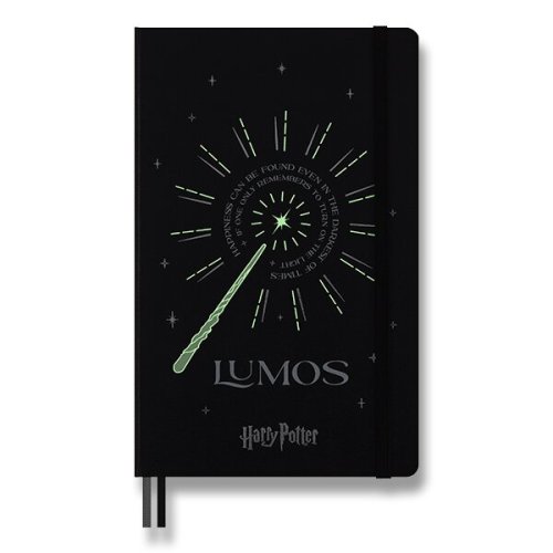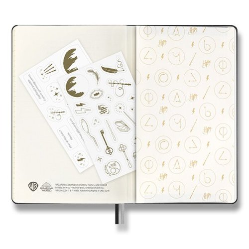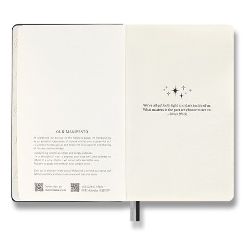Sada obsahuje:, Zápisník Moleskine Harry Potter - tvrdé desky, Rozměr: 13 x 21 cm, 88 listů, linkovaný, gramáž papíru 100 g/m², • linkovaný, velikost L, • pevná ve hřbetu šitá vazba v kartonových deskách v černé barvě, • desky obepnuté pružnou páskou proti samovolnému otevírání, • kapsa na vizitky a drobnosti, • textilní záložka a letákem s historií MOLESKINE, • včetně tematických samolepek, • neobsahuje kyseliny, • papír má slonovinovou barvu, • papír vyroben z FSC certifikovaného dřeva, Roller Moleskine Kaweco, Šíře hrotu je 1 mm., • vyměnitelná kovová náplň, • tělo z ABS plastu, • ergonomický úchop, • barva náplně je černá, Diář je v anglickém jazyce., Dodáváno v elegantním kartonovém dárkovém boxu.