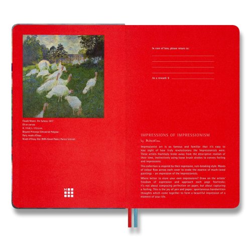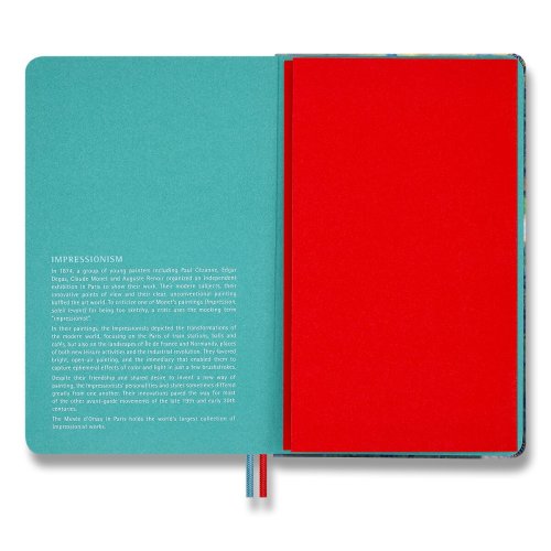ZÁPISNÍK MOLESKINE IMPRESSIONISM - TVRDÉ DESKY, Zápisník s pevnou, ve hřbetu šitou vazbou v kartonových deskách potažených látkou obepnuté pružnou páskou proti samovolnému otevírání. Zápisník vybaven kapsou na vizitky a drobnosti,, která je vyrobena z tkaniny a kartonu, dvojitou textilní záložkou, tematickou pohlednicí a letákem s historií MOLESKINE., Gramáž papíru 100 g/m², neobsahuje kyseliny. Papír v slonovinové barvě, vyroben z FSC certifikovaného dřeva., ROZMĚR: 13 x 21 cm, 88 listů, linkovaný, , Dodáváno v kartonovém dárkovém boxu