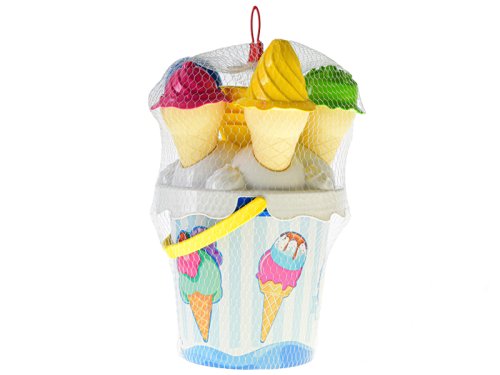 Dětská sada na hraní na pískoviště, na zahradu nebo do vody v podobě cukrárny. Obsahuje kyblíček, 4 kornoutky, 4 barevné čepičky ve tvaru zmrzliny, naběračku a bábovičku ve tvaru malého kelímku.