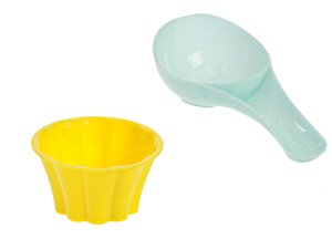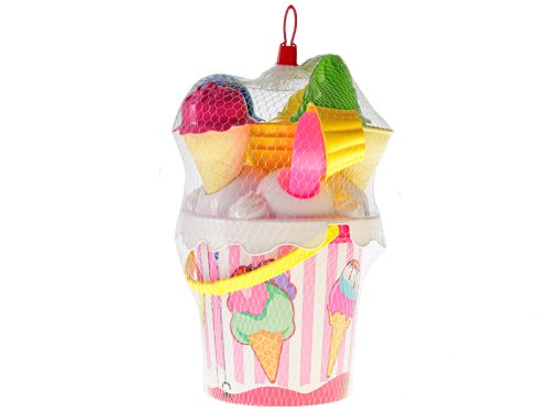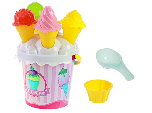 Dětská sada na hraní na pískoviště, na zahradu nebo do vody v podobě cukrárny. Obsahuje kyblíček, 4 kornoutky, 4 barevné čepičky ve tvaru zmrzliny, naběračku a bábovičku ve tvaru malého kelímku.
