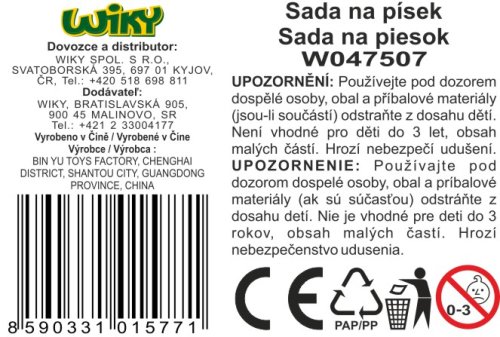 Sada na písek 8 ks. Rozměry 16x23 cm. Obsahuje kbelík hrad, lopatka, hrabičky, loď, 4 formičky.