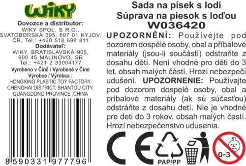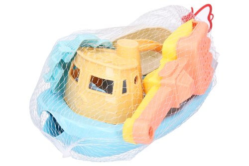 Sada na písek s lodí. Velikost lodě 22 cm. Součástí loď, lopatka, hrábě, 2 formičky.