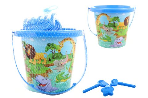 Sada na písek obsahuje kyblík, hrabičky, lopatku a formičku ve tvaru hvězdičky. Baleno v síťce. Rozměry kyblíku cca 13x15 cm. Věk 3+