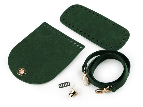 Sadu z broušené eko kůže využijete na výrobu háčkované nebo pletené kabelky z přízí či špaget. Obsahuje všechny potřebné díly - dno a klopu s otvory, mechanické zapínání a popruh na karabiny. Otvory mají Ø5 mm, usnadní vám práci. Můžete se nechat inspirovat podrobným fotonávodem na výrobu kabelky. Určitě stojí za zhlédnutí. Dno má 34 otvorů, na klopě je 13 otvorů. Dno měří 9 x 20 cm, klopa měří 15 x 17 cm. V klopě je otvor určený na zapnutí kabelky s kovovým okrajem. Hotová kabelka může mít přibližně rozměry 20 x 20 x 9 cm. Ale záleží jen na vaší představě, jak velkou si ji uděláte.
