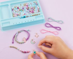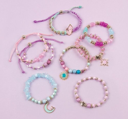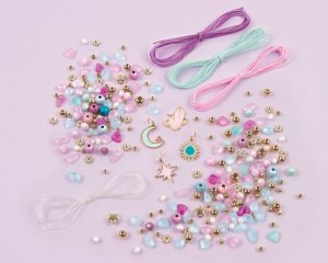 Sada obsahuje komponenty na výrobu osmi náramků. Oživte svůj svět kreativity a vyrobte si náramky dle vlastní představy. Sada obsahuje: 3 barevné šňůrky a čirou elastickou šňůrku, korálky, perličky, hvězdičky (260 ks) a 4 přívěšky. Baleno v krabici. Vhodné pro děti od 8 let.