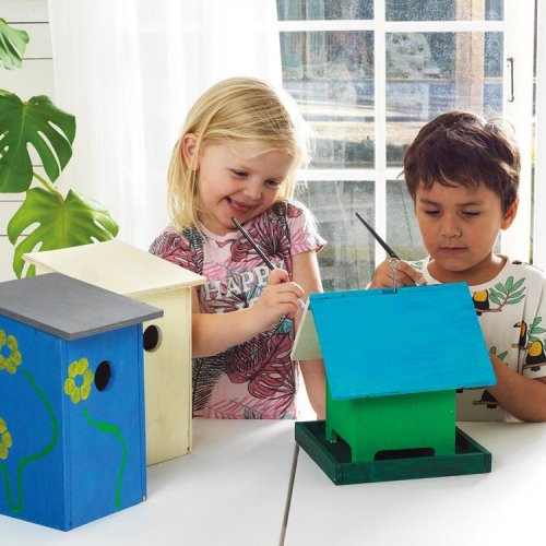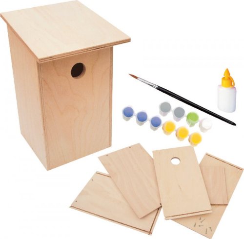 Postav domov pro ptáčky a vymaluj si ho podle vlastní fantazie! Sada na výrobu dřevěné budky pro ptáčky může zdobit tvoji zahradu nebo třeba balkon. Podle přiloženého obrázkového návodu sestav (klidně za pomoci tatínka nebo maminky) budku. Pak už se můžeš pustit do zdobení, použij přiložené barvičky, šablony a štětec, jen ať je domeček pro ptáčky pěkně barevný. Bude to zábava a výsledek bude stát určitě zato! Sada obsahuje: * dřevěné části budky * šroubky * lepidlo * barvy * štětec * šablony * a návod