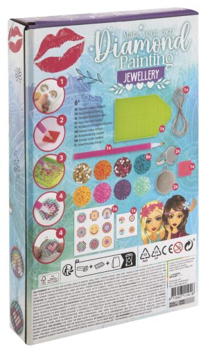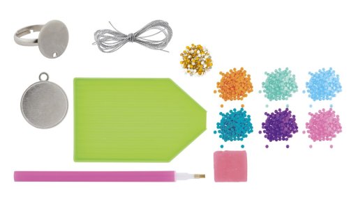 Sada na výrobu šperký – diamantové malování – sada obsahuje – 8 barev kamínků, aplikátor, pořadač, řetízek, šablonu prstenu, šablonu přívěsku na řetízek, 1 aršík samolepek na prste a 1 aršík samolepek na přívěsek.