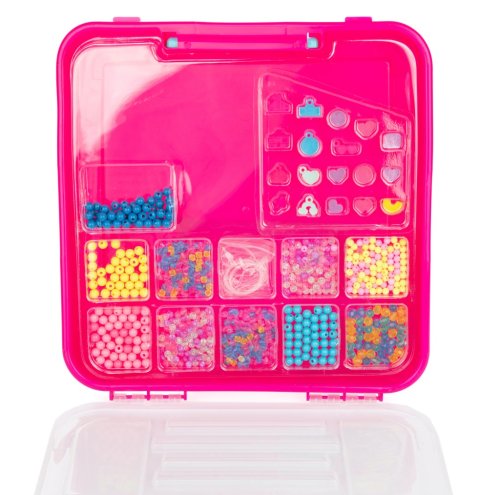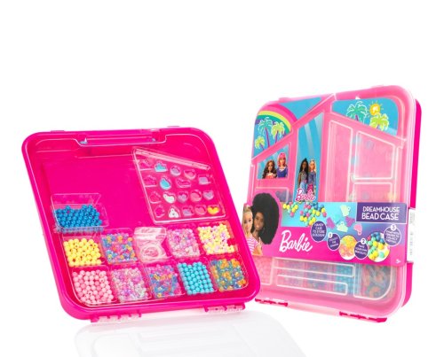 Sada na výrobu šperků v kufříku Barbie – sada obsahuje 10 boxů s různobarevnými korálky, šňůrky na navlékání a speciální koráky ve tvaru Barbie.
