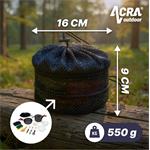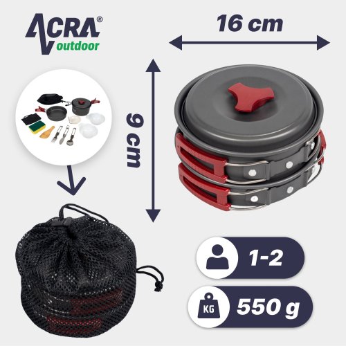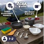 Trávíte rádi čas pod stanem nebo v kempu? Usnadněte si přípravu jídla a pořiďte si ultralehkou a kompaktní sadu nádobí Acra C20. Díky praktickým skládacím rukojetím ušetříte místo ve svém batohu. Pomocí sady připravíte oběd nebo večeři až pro 2 osoby. Hodí se pro turistiku, na kempování i na piknik.