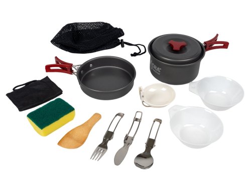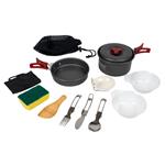 Nádobí je vyrobené z hliníkové slitiny a plastu. Odolá i náročným podmínkám, takže si ho bez obav přibalíte s sebou na cesty. Hliník navíc zajišťuje rovnoměrný ohřev při vaření pokrmu. Díky tvrdému eloxovanému povlaku nádobí snadno očistíte.
