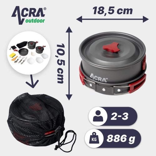 Trávíte rádi čas pod stanem nebo v kempu? Usnadněte si přípravu jídla a pořiďte si ultralehkou a kompaktní sadu nádobí Acra C21. Díky praktickým skládacím rukojetím ušetříte místo ve svém batohu. Pomocí sady připravíte oběd nebo večeři až pro 3 osoby. Hodí se pro turistiku, na kempování i na piknik.
