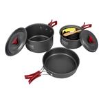 Nádobí je vyrobené z hliníkové slitiny a plastu. Odolá i náročným podmínkám, takže si ho bez obav přibalíte s sebou na cesty. Hliník navíc zajišťuje rovnoměrný ohřev při vaření pokrmu. Díky tvrdému eloxovanému povlaku nádobí snadno očistíte.