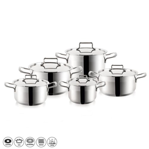 Sada nádobí s poklicí. Kastrol 1.2 (pr. 16cm, v. 10cm), kastrol 2.3 litry ( pr. 18cm, v. 10cm) kastrol 3 litry (pr. 20 cm, v. 10 cm), kastrol 4.3 litru (pr. 22 cm, v. 12 cm) a kastrol 6.2 litru (pr. 24cm, v. 14cm). Nerezové kastroly a hrnce představují díky používaným technologiím a kvalitním materiálům výrobek vhodný pro každou moderní domácnost a jsou ideální cestou ke zdravé výživě, dietní, ekonomické a estetické přípravě pokrmů. Nabízené nádoby jsou vyrobeny z vysoce kvalitní nerezové oceli 18/10. Všechny kastroly mají pokličky. Naakumulovaná energie předává teplo dále do nádoby (tepelný zdroj vypínáme v předstihu). Nádobí lze používat na všechny typy spotřebičů. Vhodné i do myčky nádobí. Vaření bez tuku, bez ztráty vitamínů a minerálů obsažených v potravinách. Nádobí představuje dokonale hygienické prostředí pro vaření a uchování potravin. Zachování přirozené chuti a hmotnosti upravovaných potravin. Vnější a vnitřní povrch nádob je vysoce leštěný, takže brání usazování nečistot a zaručuje dokonalou údržbu. Sendvičové dno s termoakumulačními vlastnostmi zaručuje rychlé a ekonomické vaření s výraznou úsporou energie. EAN 8592381140922