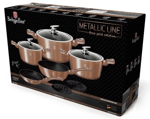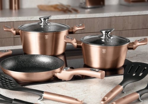 Luxusní sada nádobí BerlingerHaus z kolekce Rosegold Metallic Line v atraktivním designu zaujme nejen vzhledem, ale i špičkovými vlastnostmi. Díky 3vrstvému nepřilnavému povrchu s mramorovým efektem se potraviny nepřipalují a nádobí se snadno čistí. Sada je vhodná pro zdravé vaření s minimem tuku a pro všechny typy sporáků včetně indukce.