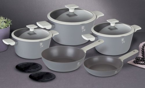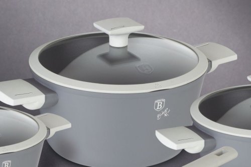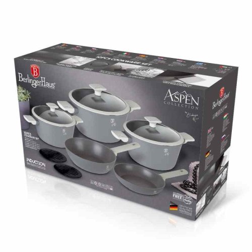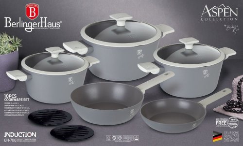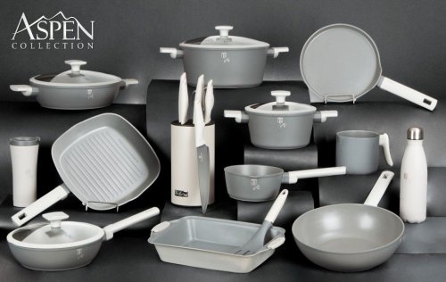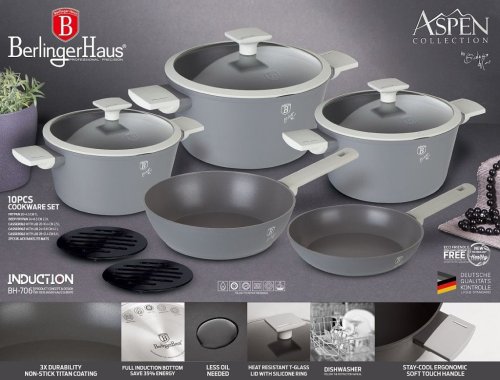 Sada nádobí Berlingerhaus Aspen Collection se skládá ze 2 pánví, 3 hrnců s poklicemi a 2 podložek pod horké kastroly. Využijete je pro každodenní přípravu svých oblíbených pokrmů. Nádobí se stane vaším univerzálním pomocníkem při vaření, dušení i smažení. Vnitřní vrstva všech kastrolů a pánví je potažená třívrstvým titanovým povrchem. Vyniká perfektní nepřilnavostí, proto se vám připravovaná jídla nepřipalují a nádobí snadno očistíte. Můžete ho dokonce umýt i v myčce na nádobí. Při vaření navíc použijete menší množství tuku či oleje.