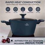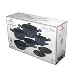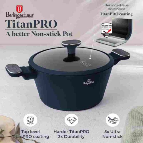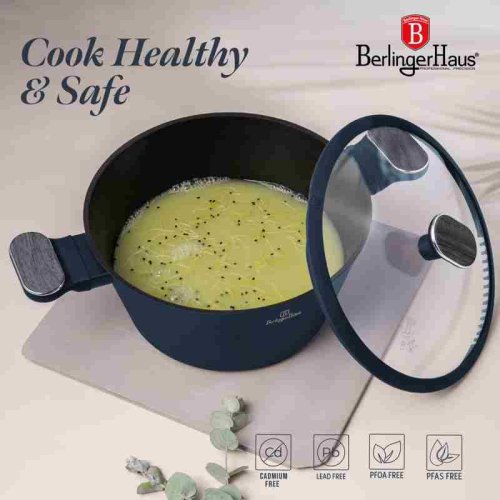 Sada nádobí Berlingerhaus BH-8381 z kolekce Deep Sea Collection přináší styl, odolnost i komfort do každé kuchyně. 3vrstvý povrch TitanPro umožňuje vaření bez připalování a s minimem tuku. Skleněná víka s funkcí cezení, parním ventilem a silikonovým těsněním posouvají komfort při vaření na novou úroveň. Ergonomické rukojeti s měkkým dotykem a chladným efektem zajišťují bezpečné a pohodlné použití. Turbo indukční dno se postará o efektivní ohřev na všech typech varných desek. Tato sada je navržena s důrazem na detaily i ekologii – bez PFOA, olova a kadmia.