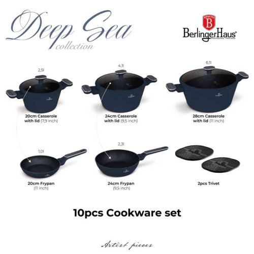 Sada nádobí Berlingerhaus Deep Sea Collection BH-8381 spojuje výjimečný design s praktickými funkcemi. Desetidílná sada s titanovým povrchem, chytrými poklicemi s cedníkem a hlubokými hrnci je ideální volbou pro každodenní i náročnější vaření.