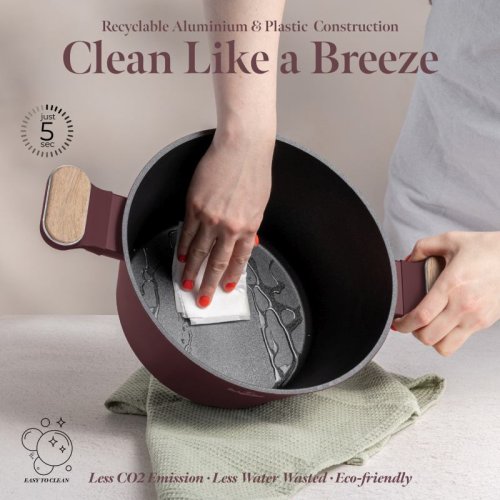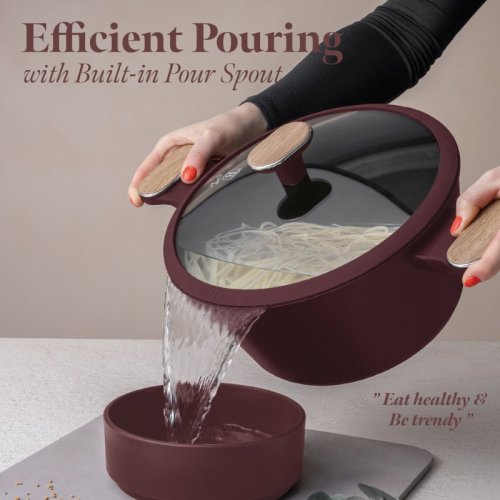 Kovaný hliník s trojitým nepřilnavým povrchem TitanPro snoubí rychlý rozvod tepla a snadné vaření bez připalování. Cedicí poklice z tvrzeného skla s otvorem pro páru dávají plnou kontrolu nad vařením a ušetří čas i spotřebu nádobí. Ergonomické rukojeti s měkkým povrchem zajišťují pohodlný úchop a nepřenáší teplo. Díky moderní kombinaci bordó barvy a dřevěných detailů působí sada elegantně, proto je vhodná také pro přímé servírování na stůl.