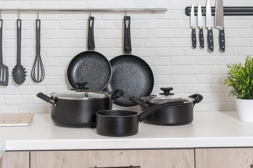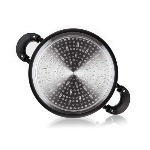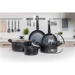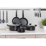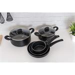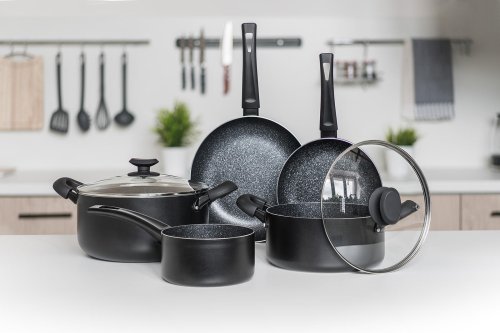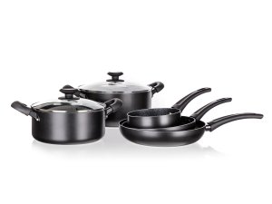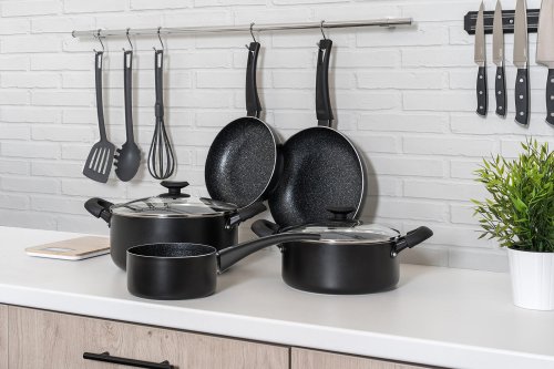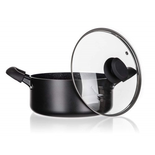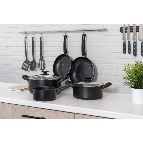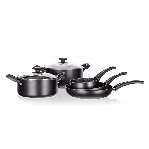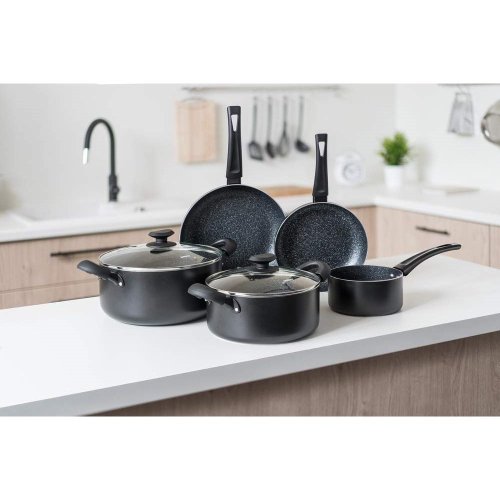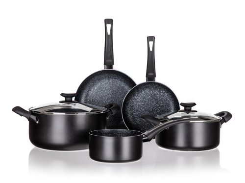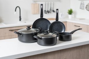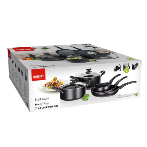 Sada hliníkového litého nádobí BLACK STONE 7 ks, obsahuje: rendlík 16 cm, hrnec 20 cm se skleněnou poklicí, hrnec 26 cm se skleněnou poklicí, pánev 20 cm a pánev 26 cm. Vše má plně indukční dno, bakelitové rukojeti se soft touch povrchovou úpravou. Nepřilnavý povrch je velmi tvrdý a odolný proti poškrábání. Výrobky v sadě jsou odolné proti nárazu a deformaci tvaru. Vysoká tepelná vodivost zajišťuje rychlé a ekonomické vaření - dlouho drží teplotu.