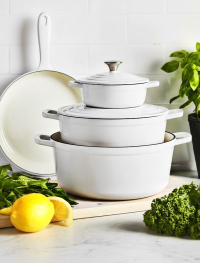 Extrémně odolné litinové nádobí od německé značky CS KOCHSYSTEME je jistotou perfektních výsledků při vaření či pečení. Výhoda litinového nádobí je ve vysoké tepelné vodivosti a následné distribuci tepla, výsledkem bude vždy křupavý pokrm s výraznou chutí a šťavnaté maso. Kompletní sada dvou hrnců, pekáče a pánve vydrží teploty v troubě až do 280°C. Vnitřní smaltovaný povrch je ideální pro zdravé vaření a navíc chrání nádobí před korozí. Celá sada je vhodná na všechny druhy sporáků. Při správném zacházení vydrží litinové nádobí i po dlouhé generace.