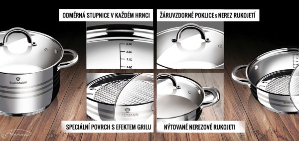 Elegantní stříbrná barva a jednotný design dodají vaší kuchyni profesionální vzhled. Pokud hledáte spolehlivou, kvalitní a dlouhodobě odolnou sadu nerezových hrnců, Blaumann Jumbo Gourmet Line je skvělou volbou pro moderní i tradiční domácnost.
