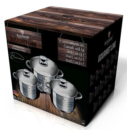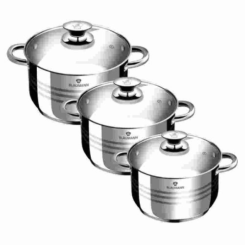 Sada 3 hrnců se skleněnými poklicemi od značky Blaumann. Nerezové nádobí je nepostradatelným vybavením v každé kuchyni. V nerezu můžete bezpečně používat kovové náčiní a také mixovat bramborovou kaši nebo pyré. Rovnoměrná a rychlá tepelná vodivost zajišťuje úsporné vaření, zatímco ergonomické rukojeti z nerezové oceli zajišťují snadnou manipulaci. Celá sada hrnců Gourmet Line je vhodná pro všechny typy ohřevu včetně indukce a lze je mýt v myčce nádobí.