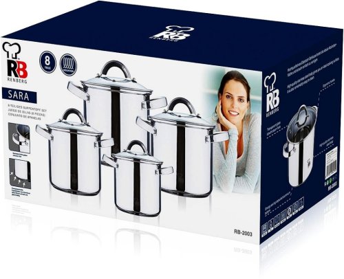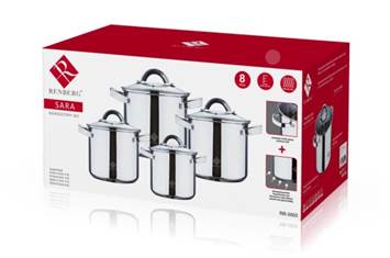 -indukční nádobí -materiál: nerezová ocel-lesklý povrch-stříbrné celonerezové rukojeti-skleněné poklice-vnitřní odměrná stupnice-hrnce:- 16 x 14,5 cm, 2,9L- 18 x 16 cm, 4,0L- 20 x 17,5 cm, 5,4L- 24 x 19,5 cm, 8,8L