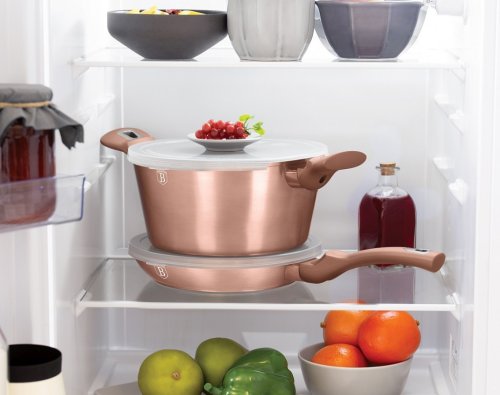 Bohatě vybavená sada nádobí z metalické rosegold kolekce zaujme nejen nepřehlédnutelným moderním designem, ale především svými jedinečnými vlastnostmi. V sadě jsou navíc 3 praktická víčka, kterými lze nádoby uzavřít.