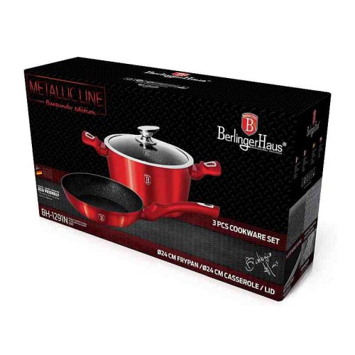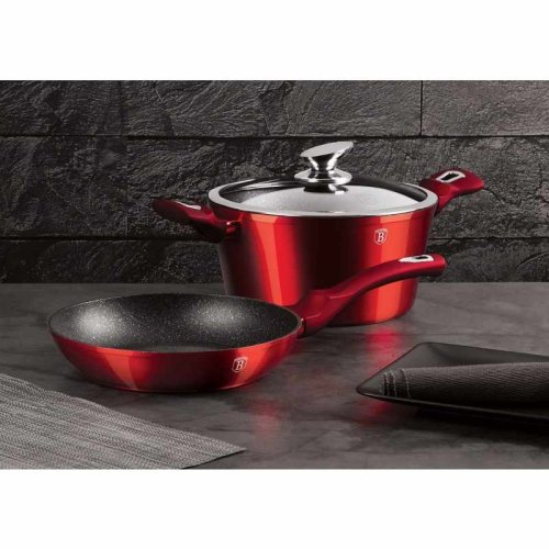 - materiál: kovaný hliník s mramorovým povrchem- barva: červená burgundy, metalická- Sada 3 ks obsahuje:- Pánev pr. 24 x 5 cm- Hrnce s poklicí pr. 24 x 12 cm- 3 vrstvý nepřilnavý povrch s mramorovým …