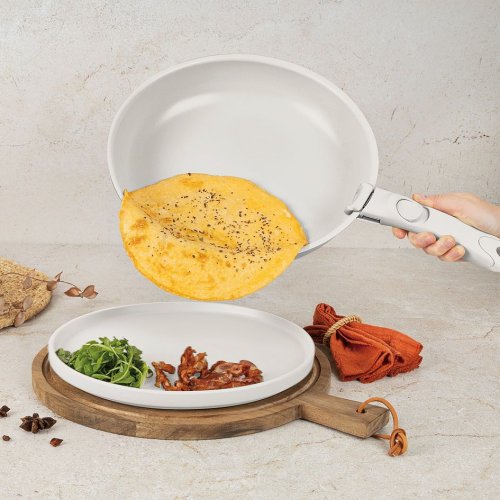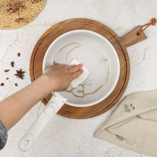 Minimalistický matný povrch v kombinaci krémové a mramorové barvy dodává sadě elegantní vzhled, zatímco turbo indukční dno zajišťuje rychlé a rovnoměrné vaření. Víka z tvrzeného skla s tepelně odolným systémem Soft Close umožňují bezpečnou kontrolu vaření.