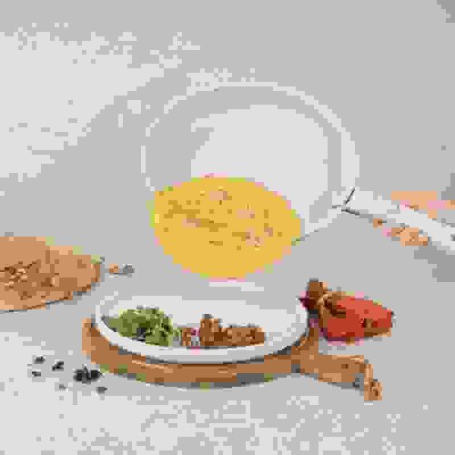 Matný povrch v kombinaci krémové a dřevěné barvy dodává sadě stylový a moderní vzhled, zatímco turbo indukční dno zajišťuje rychlé a rovnoměrné vaření. Víka z tvrzeného skla se silikonovým systémem Soft Close umožňují bezpečné zavírání a kontrolu vaření.