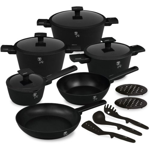 - Obsah sady: Hluboká pánev O24*6,5 cm (2,3L), pánev O28*5,2 cm (2,4L), kastrol s poklicí O20*10,4 cm (2,5L), kastrol s poklicí O24*11,8 cm (4,1L), kastrol s poklicí O28*12,4 cm (6,1L), rendlík s poklicí 16 cm (1,2 L), podložka pod nádobí 2 ks, 3 ks kuchyňského náčiní.