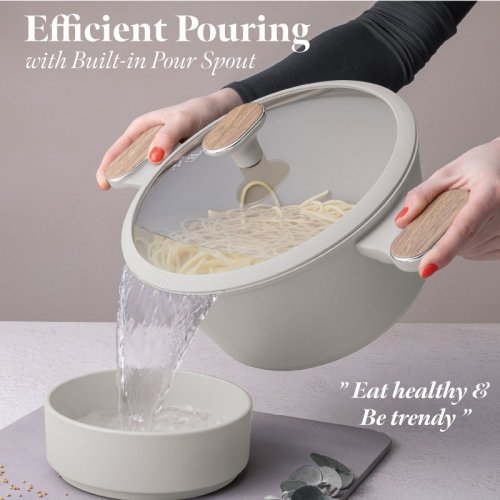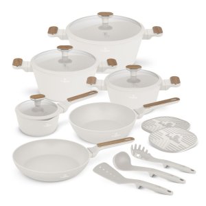 Objevte dokonalé spojení elegantního designu, moderní funkčnosti a nepřekonatelné kvality. Tato sada v jemném matném krémovém provedení s detaily ve vzhledu světlého dřeva je skutečnou ozdobou každé kuchyně. Vaření s ní není jen povinnost – je to zážitek, který si zamilujete.