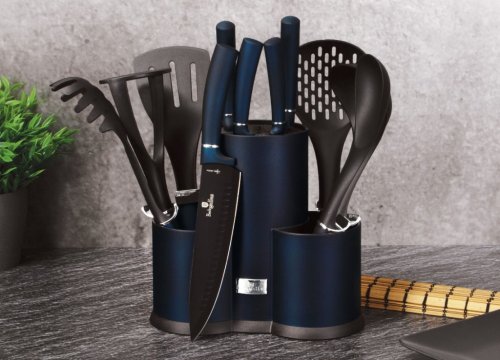 Sada nožů a kuchyňského náčiní ve stojanu 12 ks Aquamarine Metallic Line je výbornou alternativou pro kuchaře různých úrovní, na jejíž výrobu byl použit kvalitní materiál: nerez ocel s nepřilnavým povrchem, vynikají perfektní ostrostí čepele a designem. Velmi oceníte i ergonomicky tvarovanou rukojeť, díky které se vám nože budou skvěle držet. Celá sada je dílem výrobce BERLINGERHAUS, jež se výrobě nožů věnuje poměrně dlouho a jsou řádně odzkoušeny.