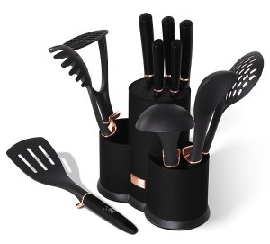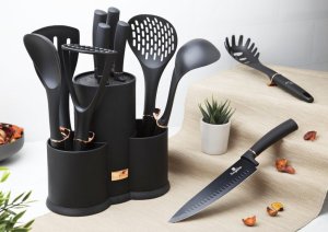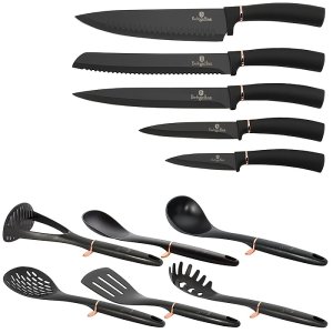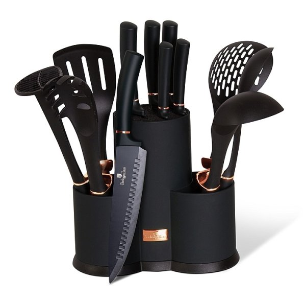 Sada nožů a kuchyňského náčiní ve stojanu 12 ks Black Rose Collection je výbornou alternativou pro kuchaře různých úrovní, na jejíž výrobu byl použit kvalitní materiál: nerez ocel s nepřilnavým povrchem, vynikají perfektní ostrostí čepele a designem. Velmi oceníte i ergonomicky tvarovanou rukojeť, díky které se vám nože budou skvěle držet. Celá sada je dílem výrobce BERLINGERHAUS, jež se výrobě nožů věnuje poměrně dlouho a jsou řádně odzkoušeny.