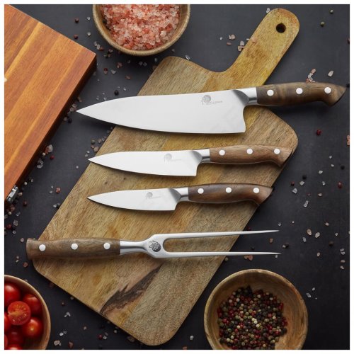 Sada nožů, která potěší každého vášnivého kuchaře. Elegantní čtyřdílná sada Dellinger Walnut obsahuje 3 kvalitní nože z německé oceli HRC 56–58 a vidličku pro snadnou manipulaci s masem či zeleninou. Vše je uloženo v luxusní dárkové krabici z akátového dřeva s kovovým zavíráním.