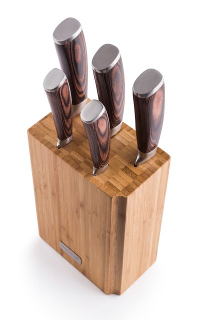 Designový stojánek je vyroben z ekologického bambusového dřeva. Dřevo je nejlepším materiálem pro uskladnění nožů. Ostří nožů se při klouzání po dřevě neztupí tak, jako je tomu u jiných tvrdších materiálů. Ve stojánku má každý z nožů své bezpečné místo. V bloku je 5 otvorů pro nože. Otvory jsou velikostí uzpůsobeny pro sadu damaškových nožů G21 Gourmet Damascus.