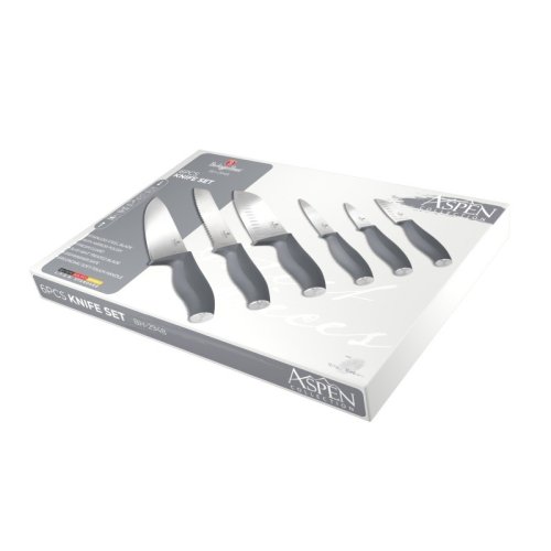 6 nožů z vysoce kvalitní nerezové oceli využijete na rozřezávání a krájení různých potravin. Najdete mezi nimi kuchařský, užitkový a okrajovací nůž, nůž na chléb a 2 nože Santoku. Elegantní design kolekce Aspen doplní každou kuchyni.