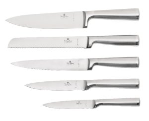 - Materiál: nerezová ocel 3cr13 s rukojetí v saténovém a zrcadlovém lesku.- Kuchařský nůž 20 cm- Krájecí nůž 20 cm- Nůž na chléb 20 cm- Užitkový nůž 12,5 cm- Nůž na okrajování 9 cm- Ocílka- Stojan BAMBOO- …