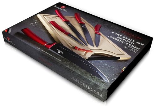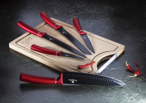 Sada nožů s nepřilnavým povrchem + prkénko 6 ks Burgundy Line je výbornou alternativou pro kuchaře různých úrovní, na jejíž výrobu byl použit kvalitní materiál: nerez ocel s nepřilnavým povrchem, vynikají perfektní ostrostí čepele a designem. Velmi oceníte i ergonomicky tvarovanou rukojeť, díky které se vám nože budou skvěle držet. Celá sada je dílem výrobce BERLINGERHAUS, jež se výrobě nožů věnuje poměrně dlouho a jsou řádně odzkoušeny.